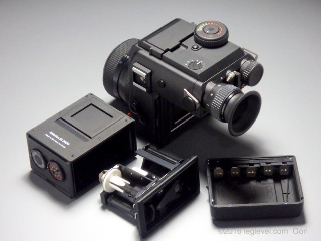 撮影途中でもフィルムの交換ができるフィルムマガジンタイプで、アイレベルファインダーとウエストレベルファインダーも標準装備、さらにシャッターボタンが2つというなんとも奇妙なカメラです。